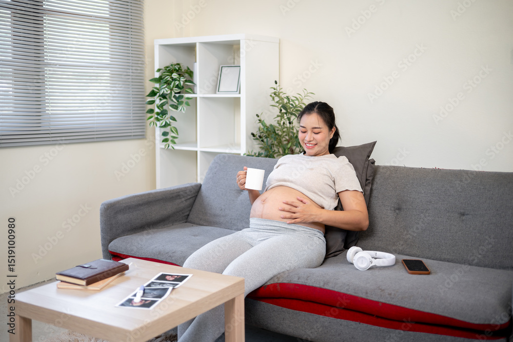 Pregnant asian woman holding a mug as she looking and touching her bare belly while sitting on sofa.
