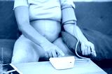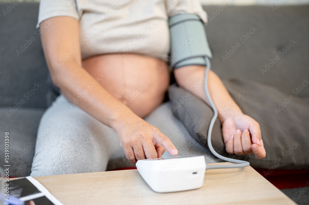 Pregnant asian woman with bare belly using blood pressure monitor for self exam as sitting on sofa.