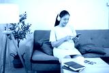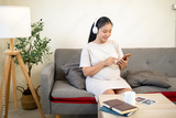 Pregnant asian woman wearing headphones listening to soothing music while sitting on sofa in house.