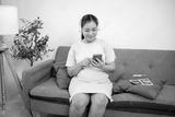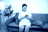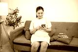 Pregnant asian woman wearing headphones listening to classical music while sitting on sofa in house.