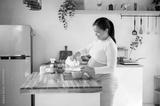 Pregnant asian woman pouring milk into cereal in wooden bowl making herself meal at kitchen counter