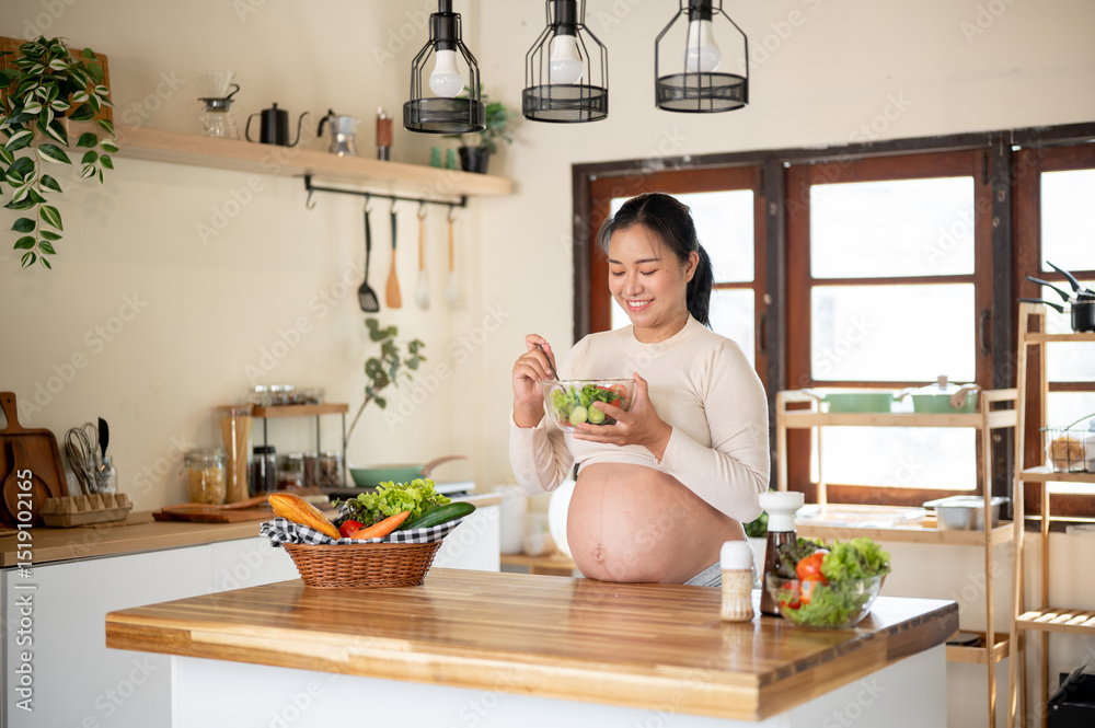 Pregnant asian woman smiling as holding glass bowl enjoy eating vegetables salad at kitchen counter.