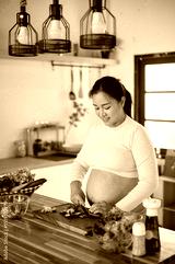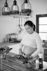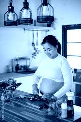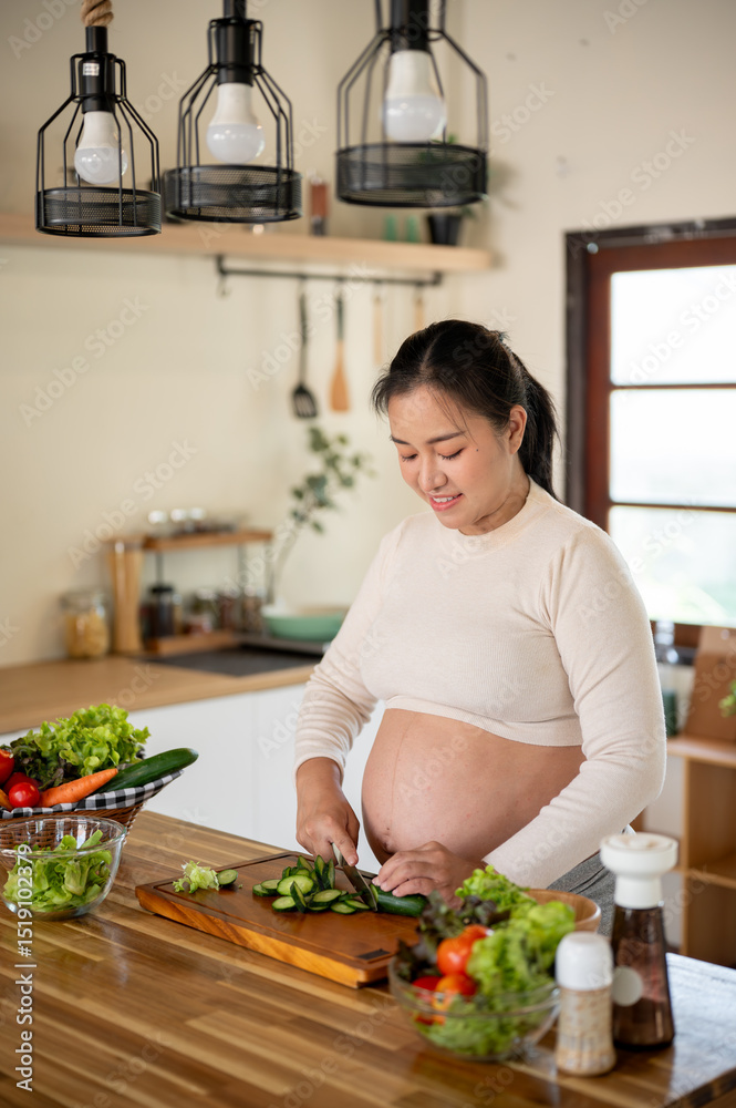 Pregnant asian woman chopping cucumbers with knife on cutting board preparing food in the kitchen.