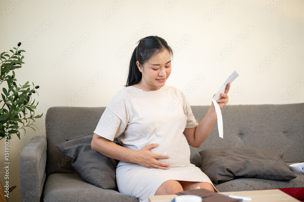Pregnant asian woman looking at ultrasound pictures and caressing her belly sitting on sofa in house