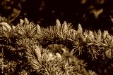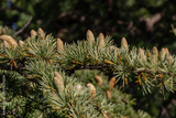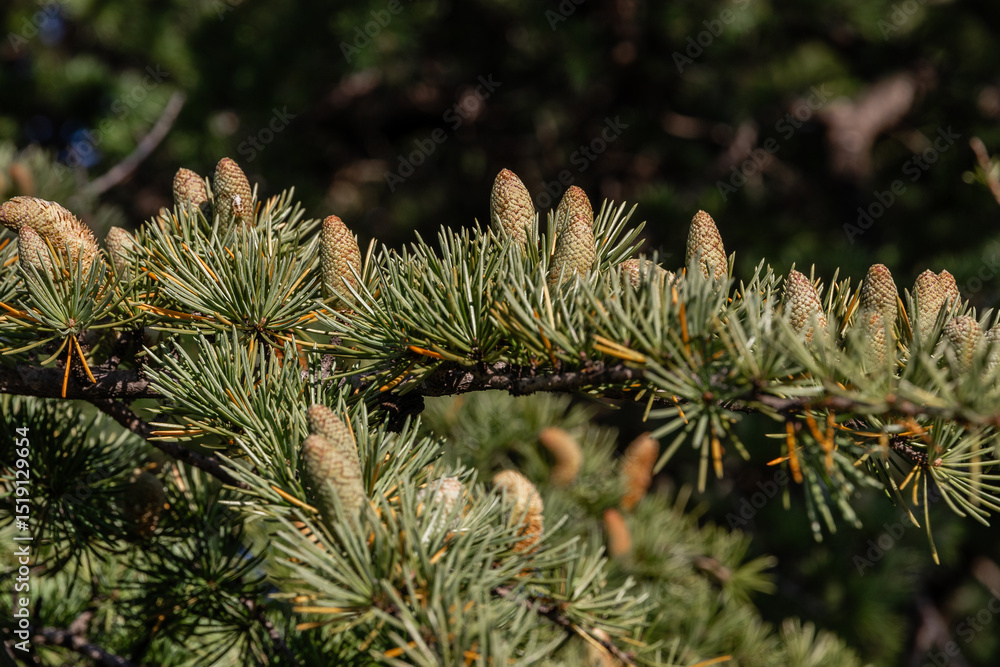 Close-up of young green larch needles. Larix sibirica, Siberian larch or Russian larc. Larch is the only deciduous European coniferous tree. A tree with fresh green leaves and cones on young branches.