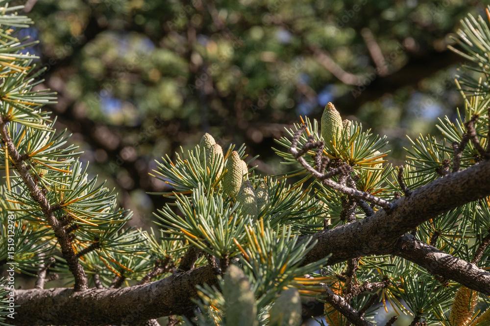 Close-up of young green larch needles. A tree with fresh green leaves and cones on young branches. Larix sibirica, Siberian larch or Russian larc. Larch is the only deciduous European coniferous tree.