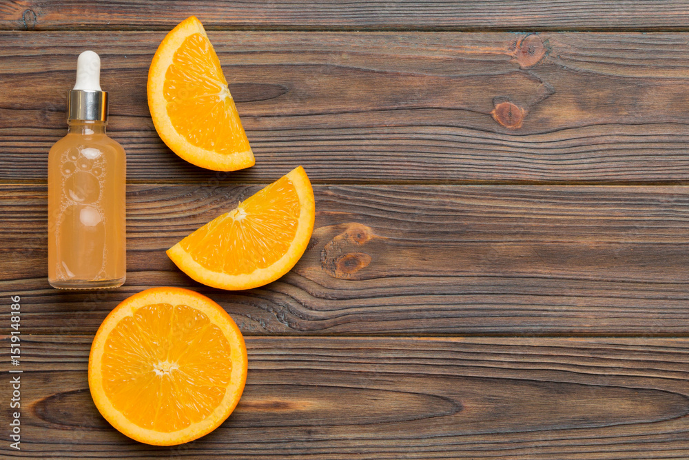 Bottles with orange fruit essential oil on wooden background. alternative medicine top view with copy space