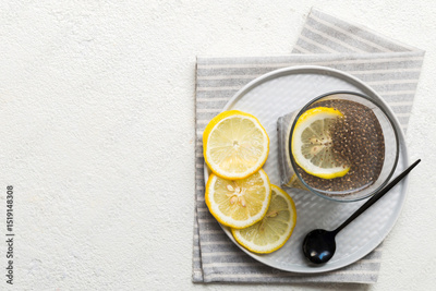 Healthy breakfast or morning with chia seeds and lemon on table background, vegetarian food, diet and health concept. Chia pudding with lemon