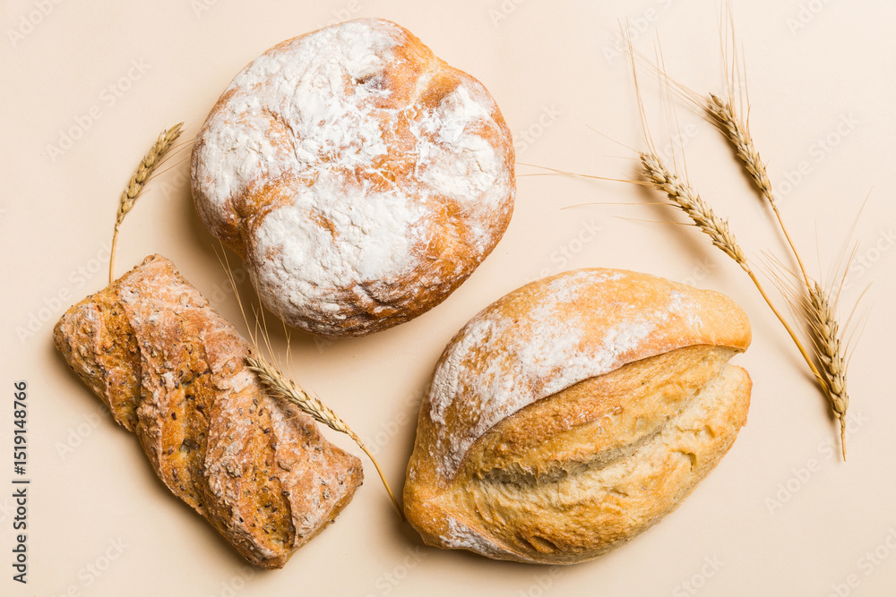 Homemade natural breads. Different kinds of fresh bread as background, top view with copy space