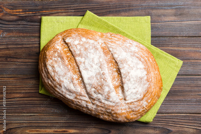 Freshly baked delicious french bread with napkin on rustic table top view. Healthy white bread loaf