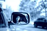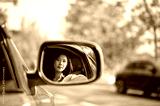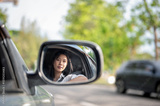 Side mirror shot of asian woman in white shirt sitting in driver seat of a car parked at the lot or roadside.