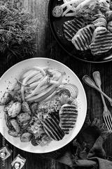Grilled pork tenderloin with baked potatoes and boiled yellow beans on wooden table
