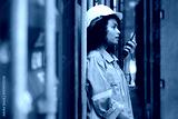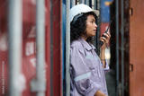 Worker or engineer using walkie talkie and talking about work in containers warehouse storage