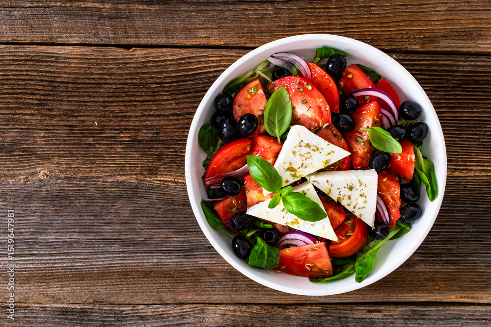 Greek style salad - tomatoes with feta cheese and black olives on wooden table