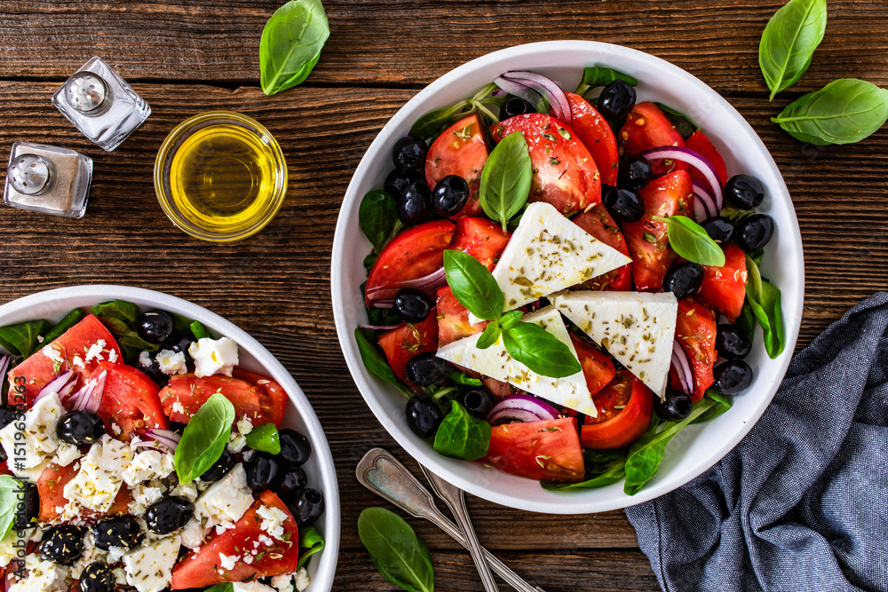 Greek style salad - tomatoes with feta cheese and black olives on wooden table