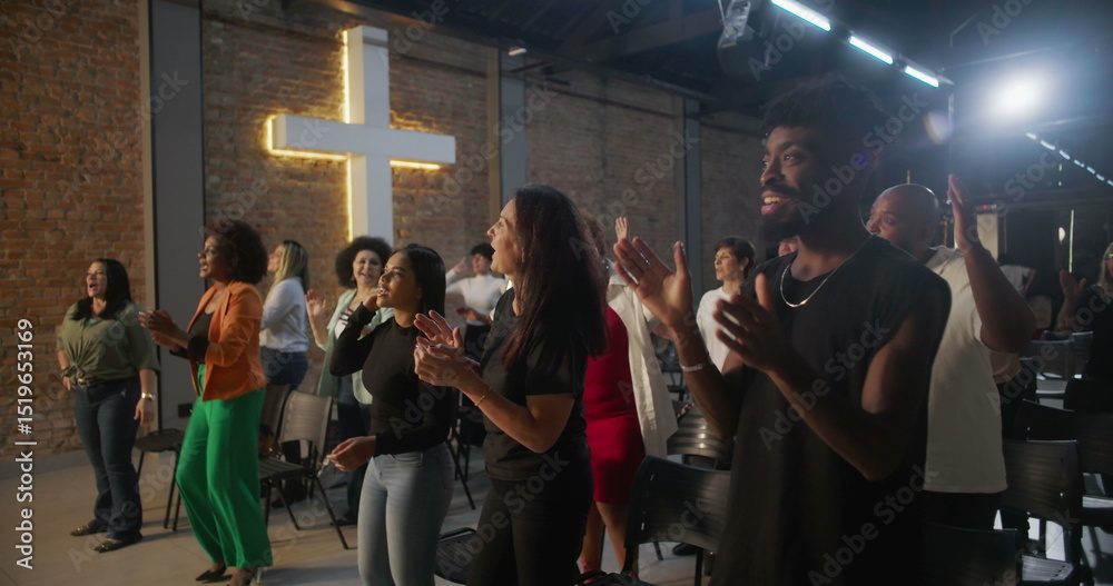 Diverse group of people clapping and smiling during worship in a church, glowing cross in background, expressions of joy, unity, and spiritual connection