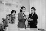Asian business team collaborating in office, discussing strategy and project planning; professional men and women using laptop during brainstorming meeting.