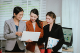 Asian business team collaborating in office, discussing strategy and project planning; professional men and women using laptop during brainstorming meeting.