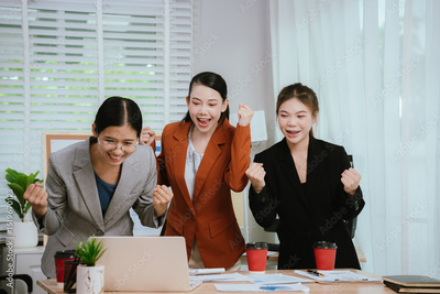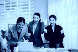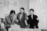 Asian business team collaborating in office, discussing strategy and project planning; professional men and women using laptop during brainstorming meeting.