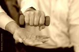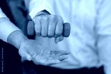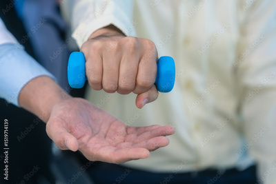 Male physiotherapist doing dumbbell exercises. Concept of physical therapy for male patient's arm and shoulder. Management of arm arthritis and stretching for rehabilitation and muscle.
