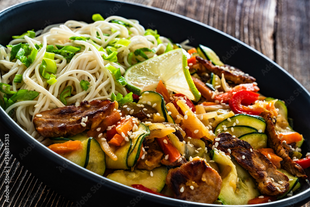 Asian food - pork tenderloin with stir fry vegetables and ramen noodles on wooden table