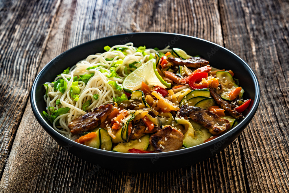 Asian food - pork tenderloin with stir fry vegetables and ramen noodles on wooden table