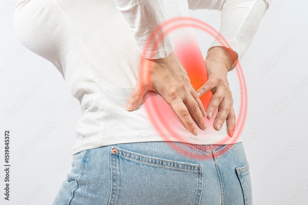Woman grabbed his lower back. Radiculitis symptom, inflammation, pain in the spine