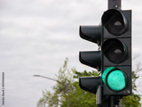 Black traffic light with a bright green signal illuminated, symbolizing go-ahead, urban transportation control, and safe road navigation.