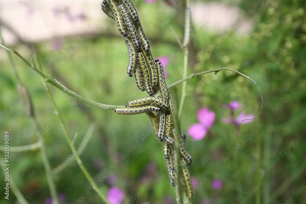 Bruchi di Pieris brassicae o farfalla Cavolaia su pianta. Fuoco selettivo