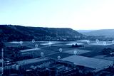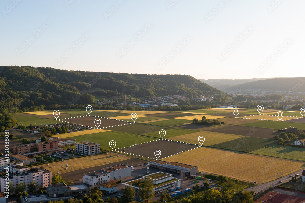 Land plot in aerial view. Gps registration survey of property, real estate for map with location, area. Concept for residential construction and development. Also home, house for sale, buy, purchase.