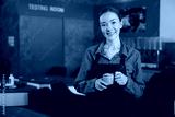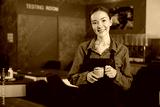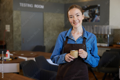 portrait young barista woman holding a cup of coffee in the cafe