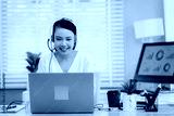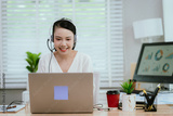 Smiling Asian female call center agent wearing a headset, speaking with a client at her office desk, providing professional customer support.