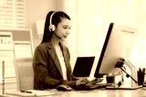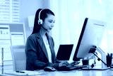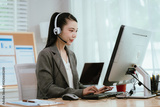 Smiling Asian female call center agent wearing a headset, speaking with a client at her office desk, providing professional customer support.