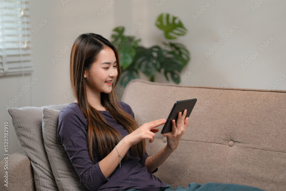 Woman thinking creative ideas content on tablet