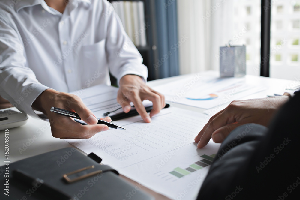 office staff analyzing accounting paperwork during financial review with attention to corporate accuracy
