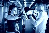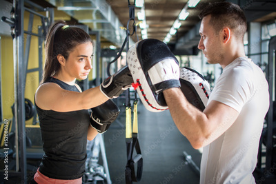 Young sporty woman punching her male partner with red boxing gloves at gym.