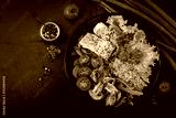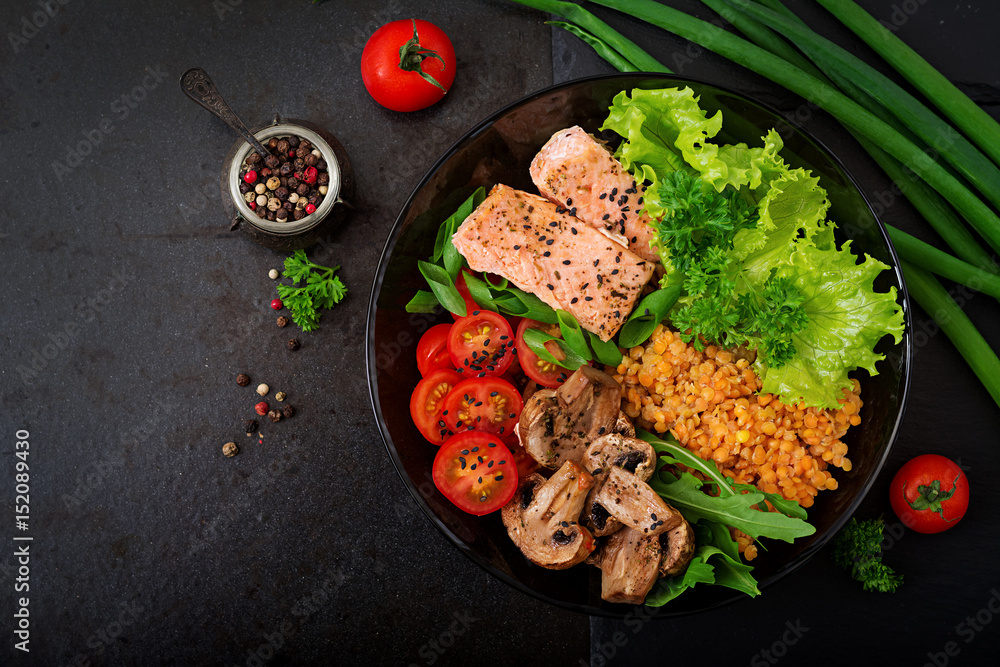 Healthy salad with salmon, tomatoes, mushrooms, lettuce and lentil on dark background