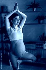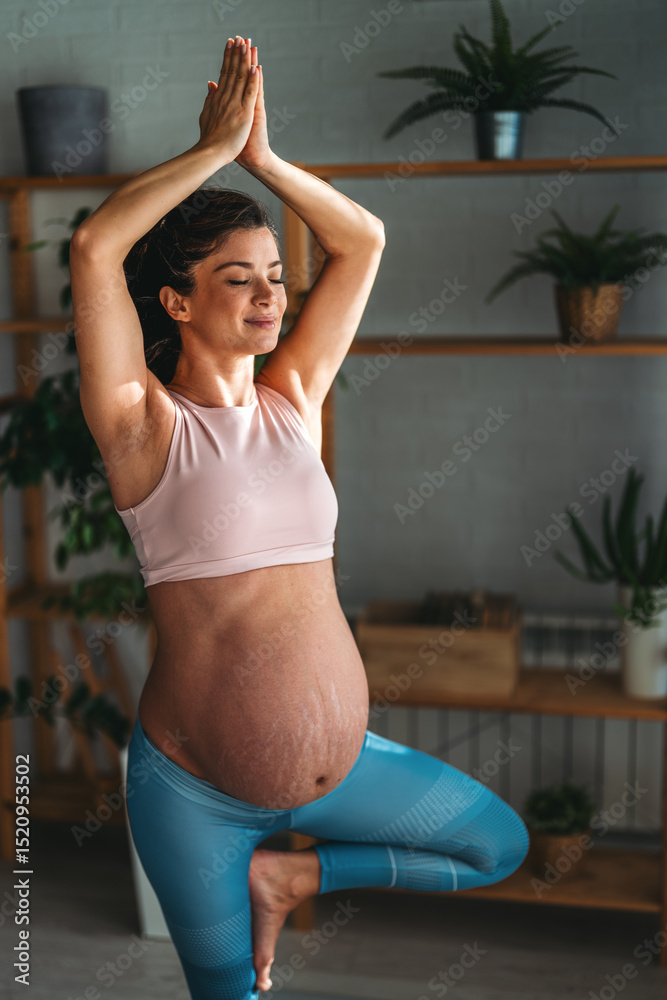 Portrait of young pregnant female working out at home. Pregnant woman practicing yoga at home.