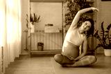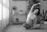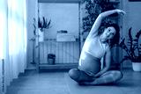 Charming pregnant fit woman in leggings and crop top exercising on yoga mat in living-room.