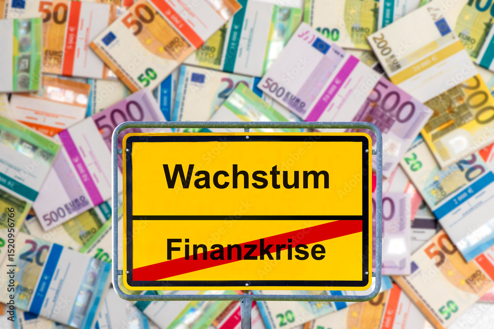 Ein Ortsschild ist beschriftet mit dem Aufdruck Wachstum vs. Finanzkrise vor vielen Euro Geldbündel - FOTOMONTAGE