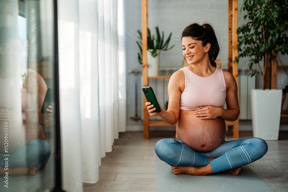 Live streaming, fitness and phone of pregnant woman exercise, pilates or workout on social media