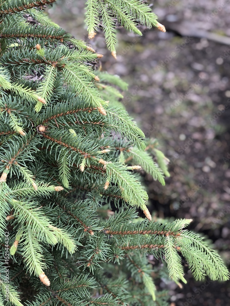 Close-up view of a vibrant spruce tree with fresh green needles in natural outdoor setting
