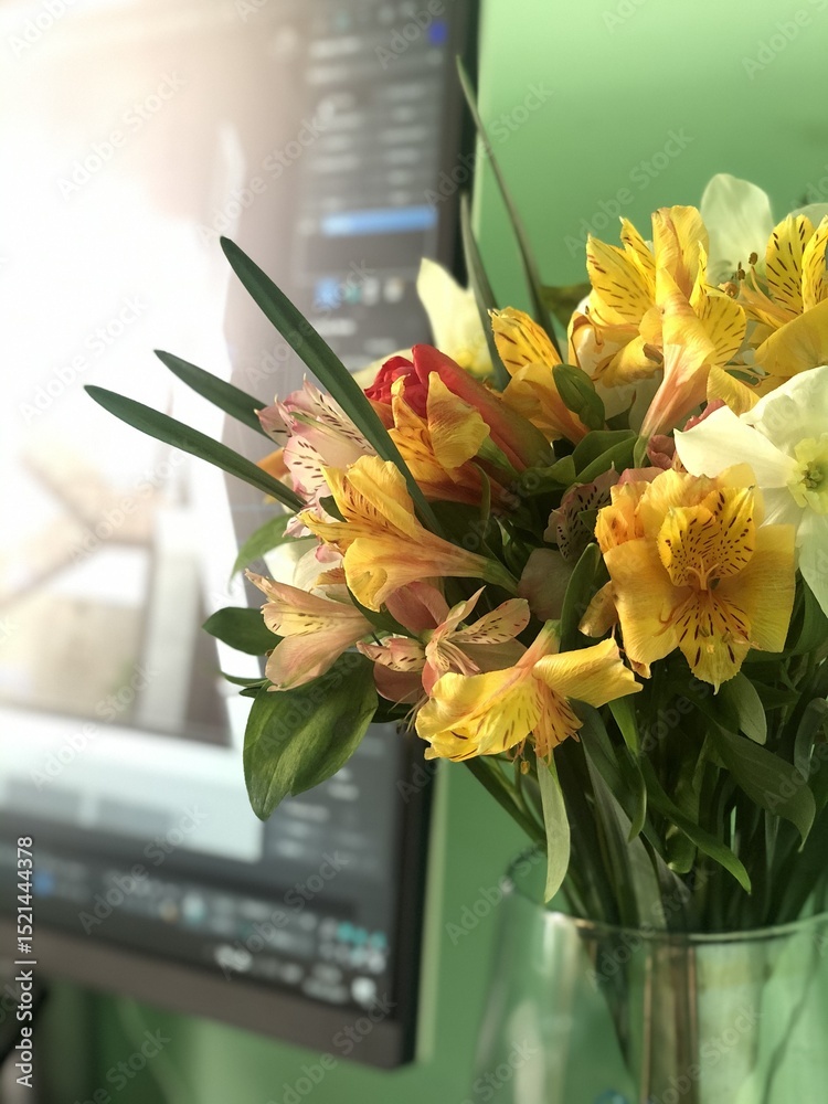 Vibrant bouquet of flowers near computer with green background and colorful floral arrangement