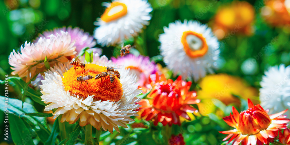 Beige red flowers Strawflower inflorescences and many bees pollinate flowers of different shades in the fields