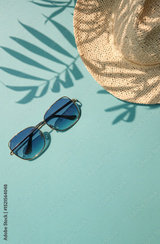 Stylish summer vacation concept composition with straw hat, sunglasses and tropical palm leaves shadows on the blue background. Copy space