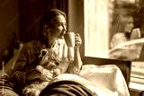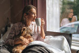 Enjoying quiet morning with small dog while sipping coffee by the window on a cozy bed in a softly lit room