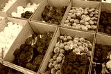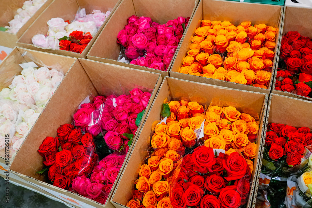 Red, orange, yellow, pink roses and other flowers in in cardboard boxes transport, storage for sale in flower shops
