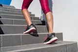 Stairs climbing running woman doing run up steps on staircase. Female runner athlete going up stairs in urban city doing cardio sport workout run outside during summer. Activewear leggings and shoes.