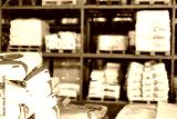 Several paper bags, bales, lie on trolley cart in the warehouse of wholesale store of building materials, gardening goods, fertilizers