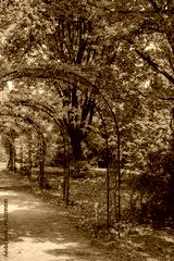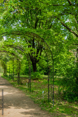 Wander through a tranquil path lined with elegant arches, surrounded by vibrant trees and greenery